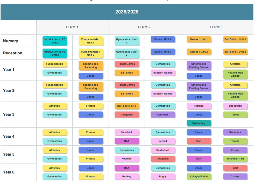 Fundamental movement skills underpin all units and the progressive knowledge for these skills is woven throughout our whole curriculum. Our bespoke curriculum meets the needs of our learners and the outcomes of the National Curriculum. Units that meet the same NC outcomes are identified by their colour. For games units, through their colour, we provide further information on the units that share the same principles of defending and attacking e.g. all invasion games are pink. By selecting and designing our own curriculum map we can ensure a structured, progressive learning journey that guides our pupils toward achieving the intended National Curriculum outcomes.